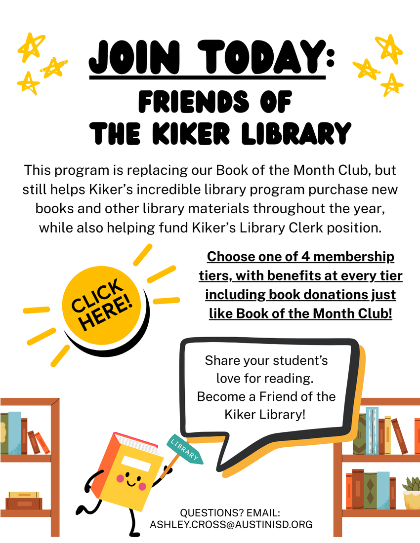 **This program is replacing our Book of the Month Club, but still helps Kiker’s incredible library program purchase new books and other library supplies throughout the year, while also helping fund Kiker’s Library Clerk position.**